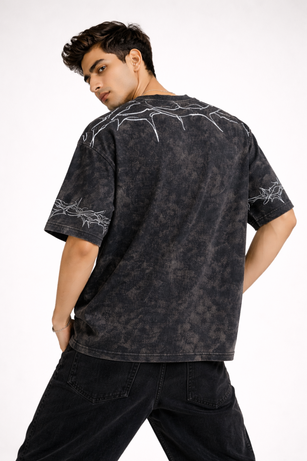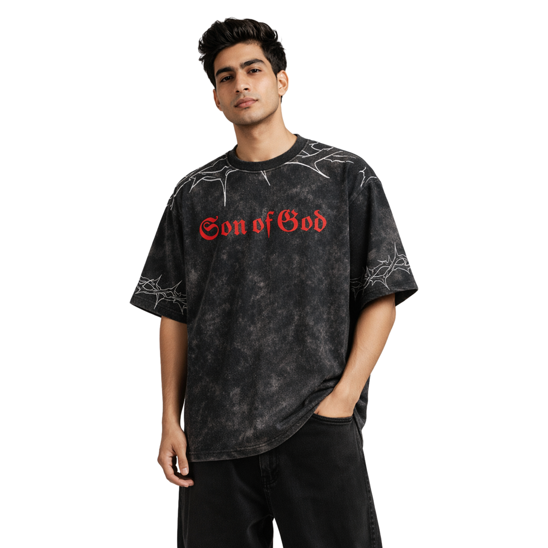 The Son of God – Obsidian Faith Tee is crafted for those who carry belief as strength, not noise. Designed in a deep washed-black finish, this Tee features bold gothic typography across the chest paired with thorn-inspired detailing on the shoulders and sleeves — symbolizing sacrifice, resilience, and unbreakable spirit.